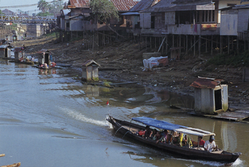 目的地の漁村では水上に二十軒ほど家が建ち、床すれすれまで水が上がっていた。 漁師の家に荷物を預けて、さっそくカヌーに乗り換える。村の中を抜けるとき、 明かりのついた部屋が暗闇の中にまるで舞台装置のようにほんのり浮かび上がり、住民の生活が影絵的に見えて興味深い。 風に乗ってギターの爪弾きが聞こえてくる。すっかりメランコリイな気分になる。